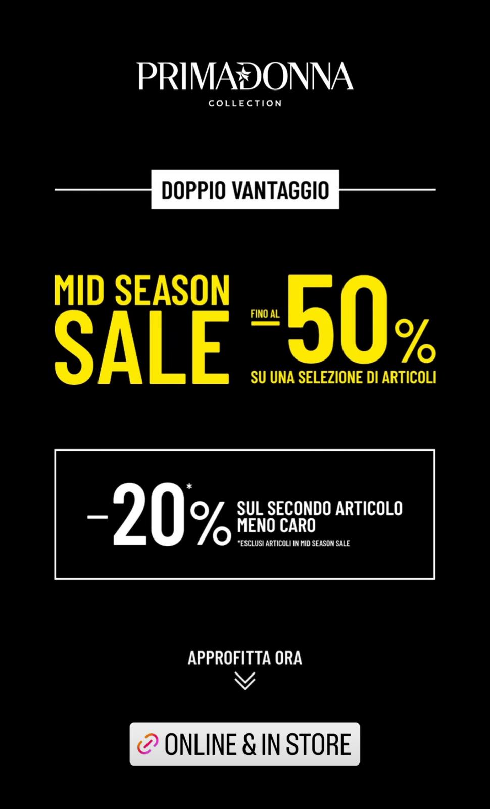 MID SEASON SALE FINO AL -50% SU UNA SELEZIONE DI ARTICOLI Dal 16/04 inizia la grande promozione MID SEASON SALE firmata Primadonna Collection. Venite a scoprire la vastissima selezione di articoli scontati fino al 50%…Vi aspettiamo in Store.